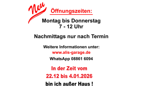 Wenn Sie jetzt Fragen haben, schreiben Sie mir eine Mail an info(at)alis-garage.de oder eine Nachricht per Whatsapp .