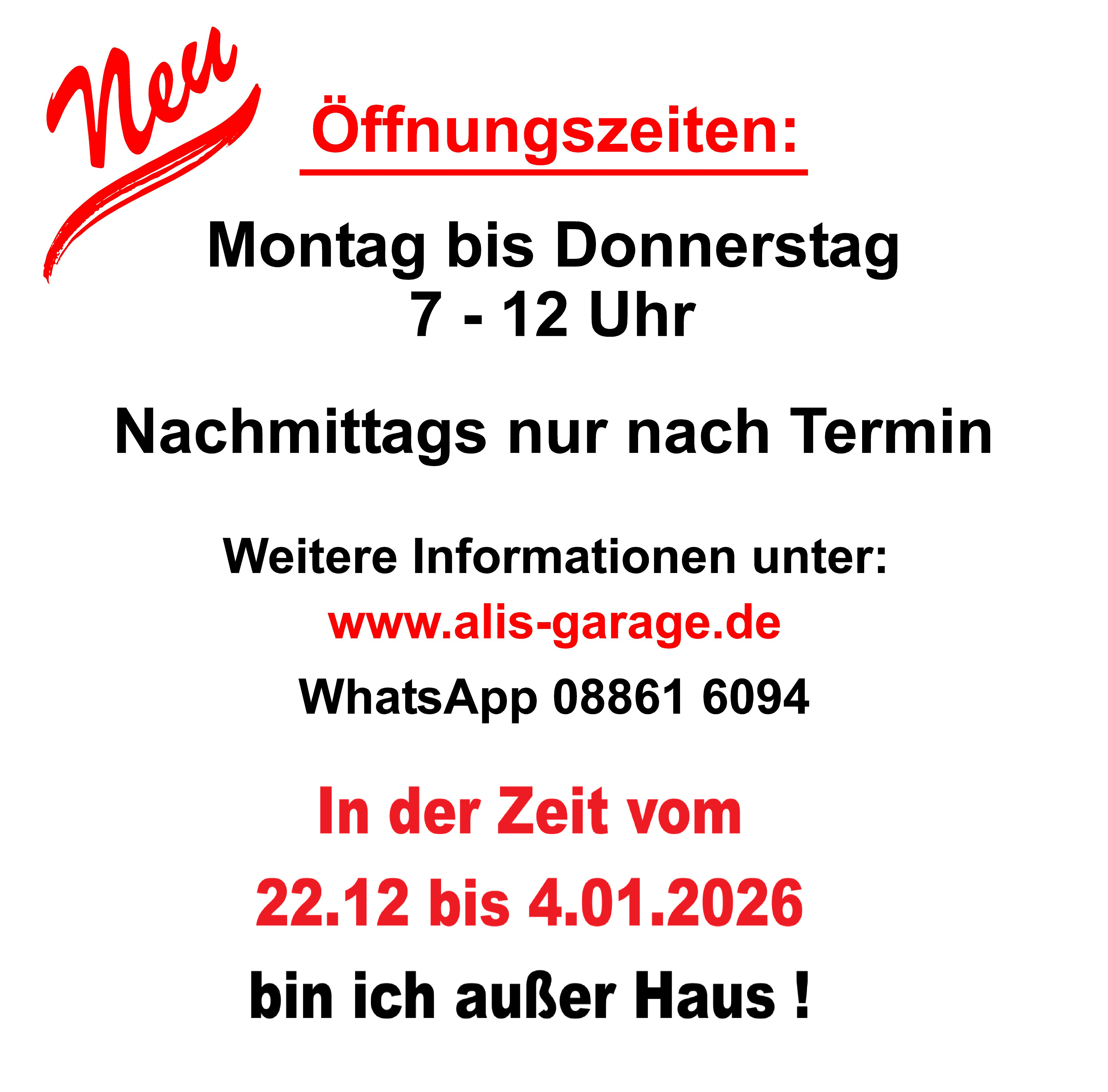 Wenn Sie jetzt Fragen haben, schreiben Sie mir eine Mail an info(at)alis-garage.de oder eine Nachricht per Whatsapp .